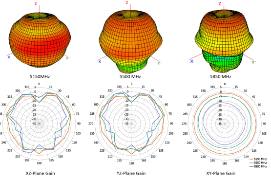 Radiation patterns provide information about the directionality and 3-dimensional gain performance of the antenna by plotting gain at specific frequencies in three orthogonal planes. Antenna radiation patterns are shown below using polar plots covering 360 degrees. The antenna graphic at the top of the page provides reference to the plane of the column of plots below it.